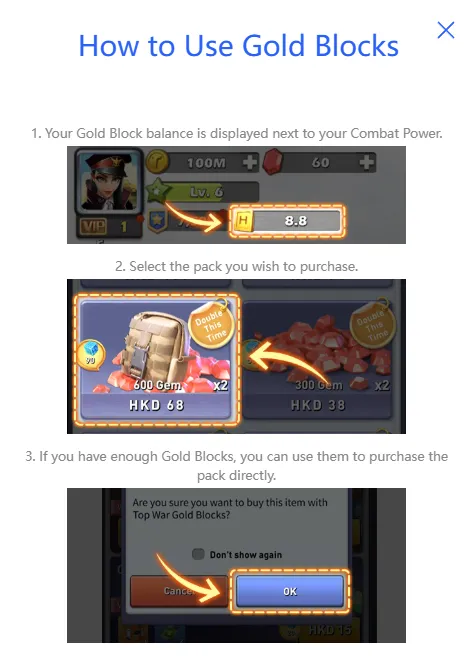 - After a successful purchase, Top War Gold Blocks will be sent immediately to the character.